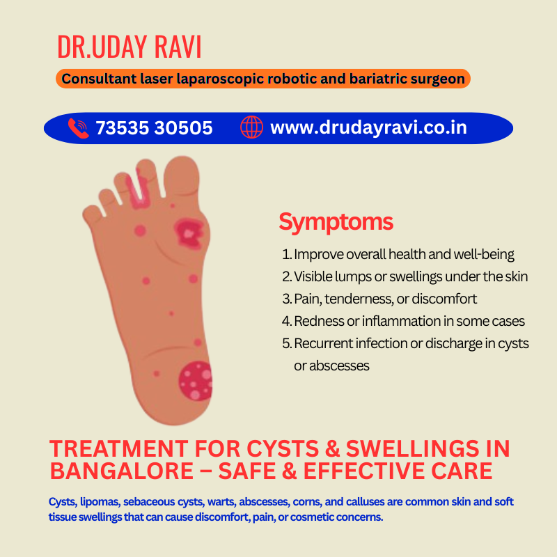 Cysts and swellings can occur due to infections, blocked glands, or benign growths and may cause pain or discomfort if left untreated. Modern treatment focuses on accurate diagnosis and safe removal using minimally invasive techniques whenever possible. This helps reduce pain, scarring, and recovery time. With proper evaluation and timely care, most cysts and swellings can be treated effectively with excellent outcomes. At Dr. Uday Ravi, treatment is planned with a focus on safety, comfort, and complete recovery.